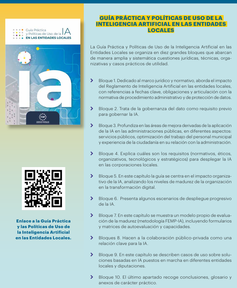 En esta GUÍA PRÁCTICA Y POLÍTICAS DE USO DE LA IA EN LAS ENTIDADES LOCALES, se incluye el análisis de los desafíos concretos a los que se enfrenta una organización, los recursos necesarios para implementarla, el marco jurídico ,la normativa aplicable y los aspectos ÉTICOS que siempre deben acompañar todo el proceso, incluyendo casos de uso sobre los cuales aplicar estas tecnologías.